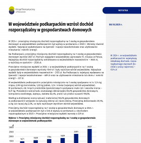 W 2024 r. przeciętny miesięczny dochód rozporządzalny na 1 osobę w gospodarstwie domowym w województwie podkarpackim był wyższy w porównaniu z 2023 r. Wzrosły również wydatki. Najwięcej wydatkowano na żywność i napoje bezalkoholowe oraz użytkowanie mieszkania i nośniki energii.