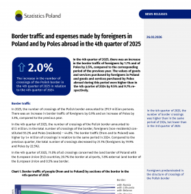 In the 4th quarter of 2025, there was an increase in the border traffic of foreigners by 1.7% and of Poles by 2.5%, compared to the corresponding period of the previous year. The values of goods and services purchased by foreigners in Poland and goods and services purchased by Poles abroad during this period were higher than in the 4th quarter of 2024 by 9.5% and 9.7% re-spectively.