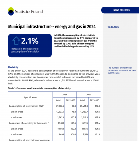Municipal infrastructure - energy and gas in 2024 A A A 16.09.2025 In 2024, the consumption of electricity in households increased by 2.1% compared to 2023 and the consumption of gas from the network by 0.9%. Sale of heat energy to residential buildings decreased by 2.7%. Downloads Municipal infrastructure - energy and gas in 2024 0.41 MB Municipal infrastructure - energy and gas in 2024 3.54 MB Municipal infrastructure - energy and gas in 2024 0.03 MB Archive 2023 Municipal infrastructure - energy and gas in 2023 2022 Municipal infrastructure - energy and gas in 2022