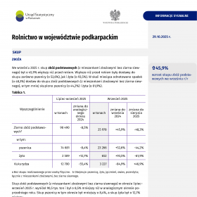 Informacja sygnalna „Rolnictwo w województwie podkarpackim” przygotowywana we Współpracy z Wojewodą Podkarpackim zawiera informacje z zakresu rolnictwa z uwzględnieniem skupu i cen ważniejszych produktów rolnych oraz koniunktury w gospodarstwach rolnych.
